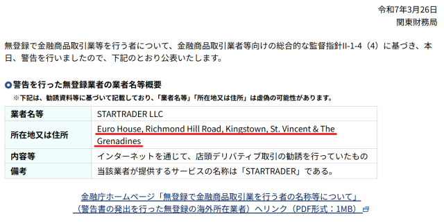 ちなみに、Bitunix本社の住所は「Euro House, Richmond Hill Road, Kingstown, SAINT VINCENT AND THE GRENADINES」となっており、この住所で検索すると過去に金融庁から警告を受けた別会社の情報が出てきます。