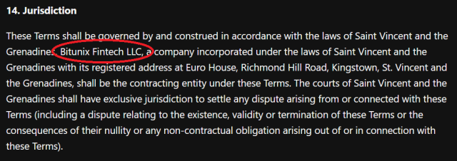 利用規約には「セントビンセント及びグレナディーン諸島の法律に準拠していること」などが記載されていますが、具体的な住所や連絡先などは書かれていません。
