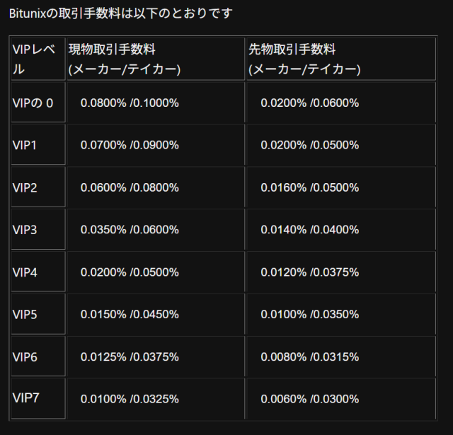また、BitunixはVIPシステムを導入し、VIPレベルが上位の人ほど手数料が安くなります。