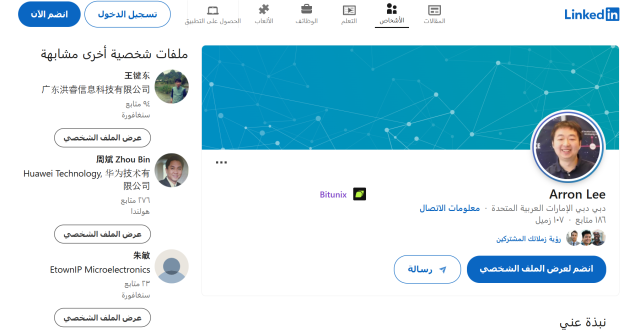 特に情報が曖昧なのがCEO。「Arron Lee」という人物がCEOを務めている情報が複数あり、Linked Inにはなぜかアラビア語で表記された彼のページが見つかります。